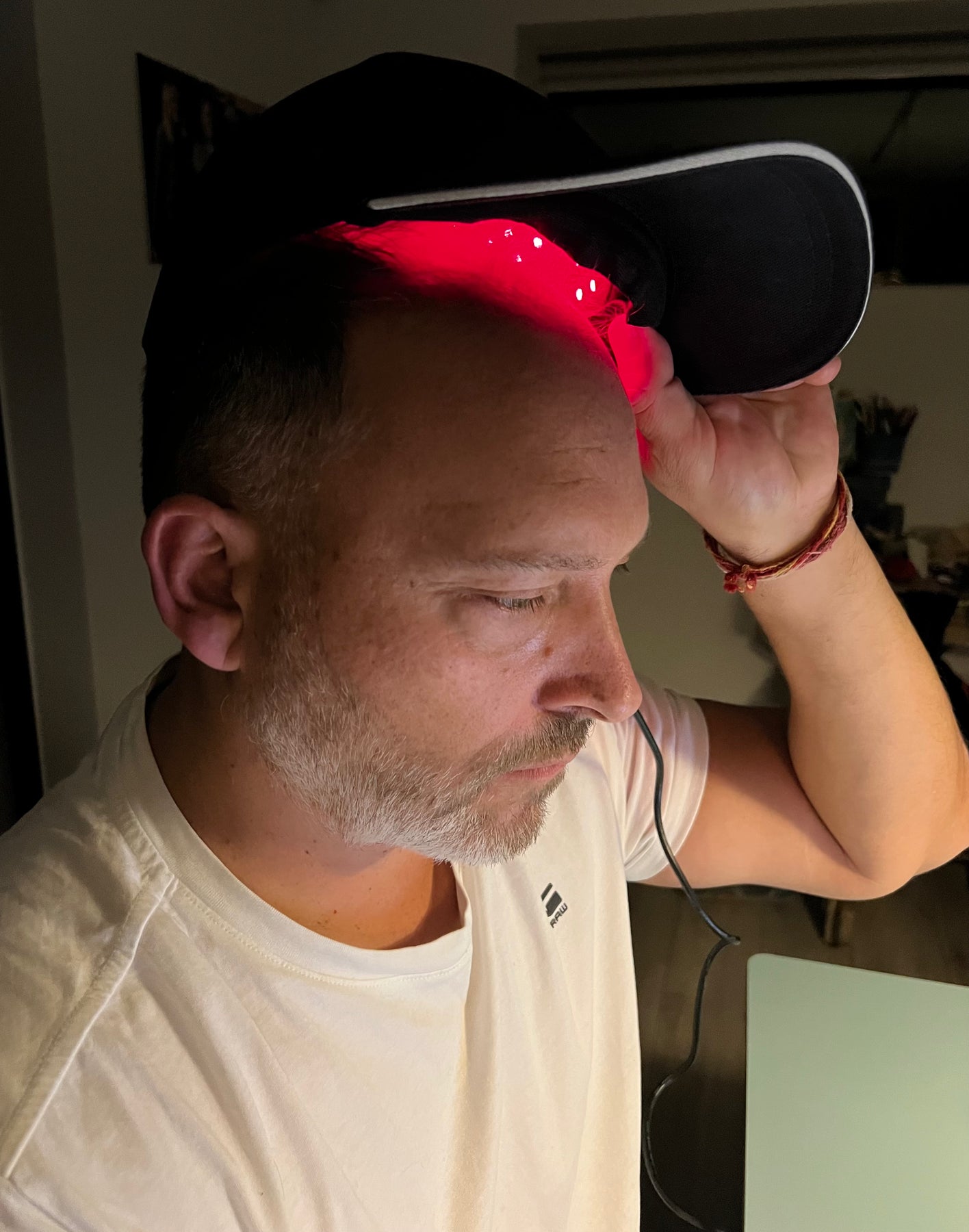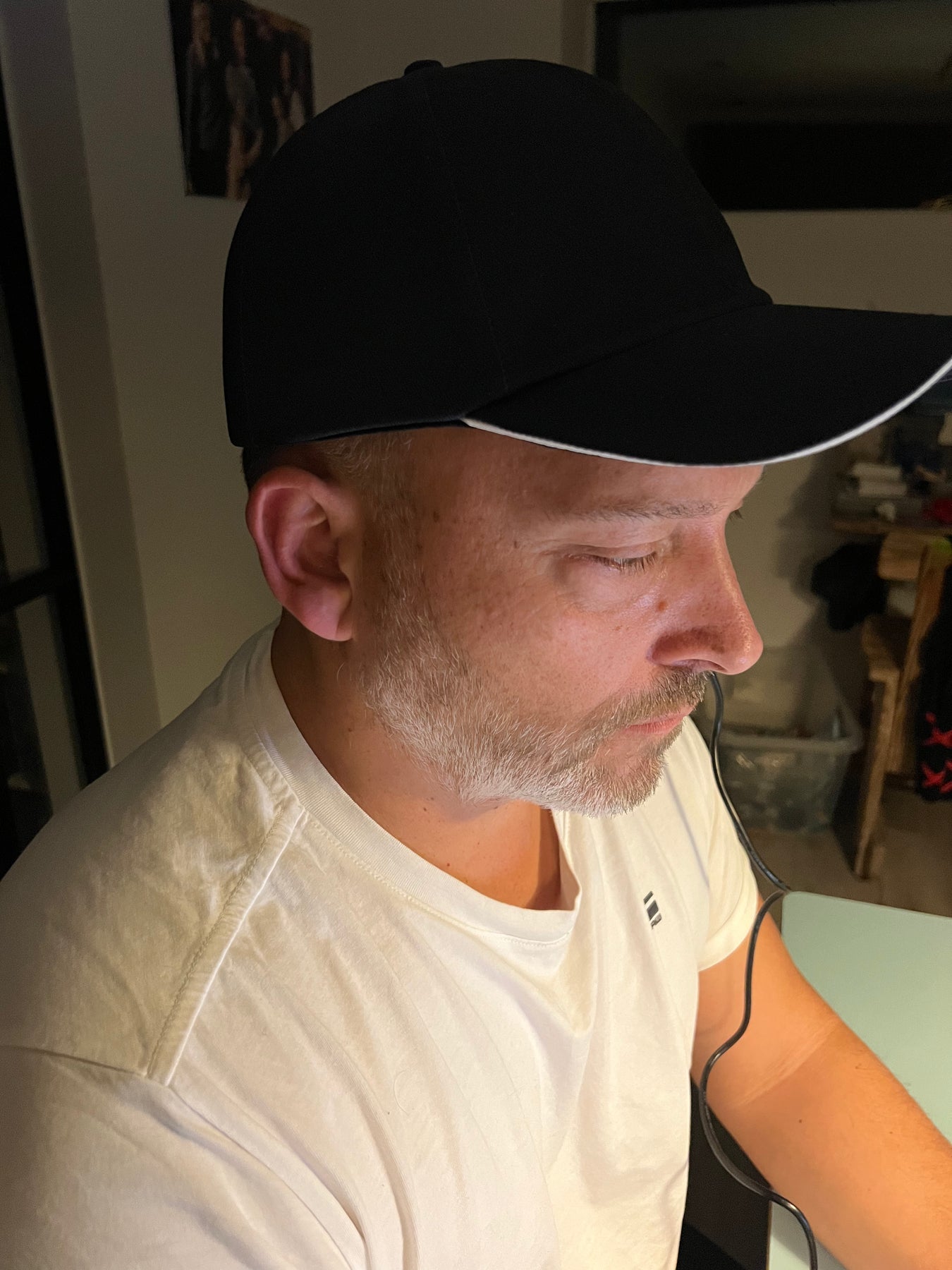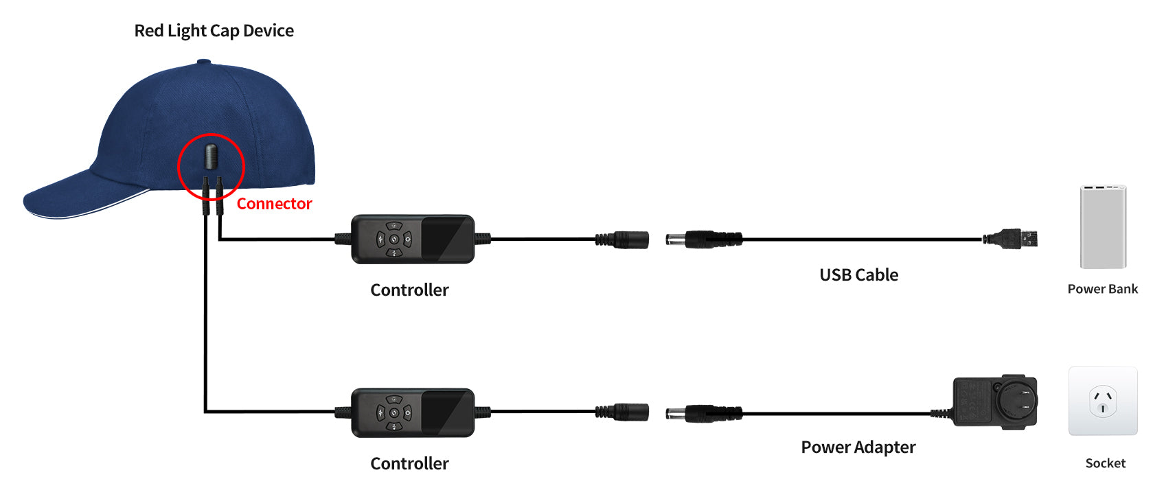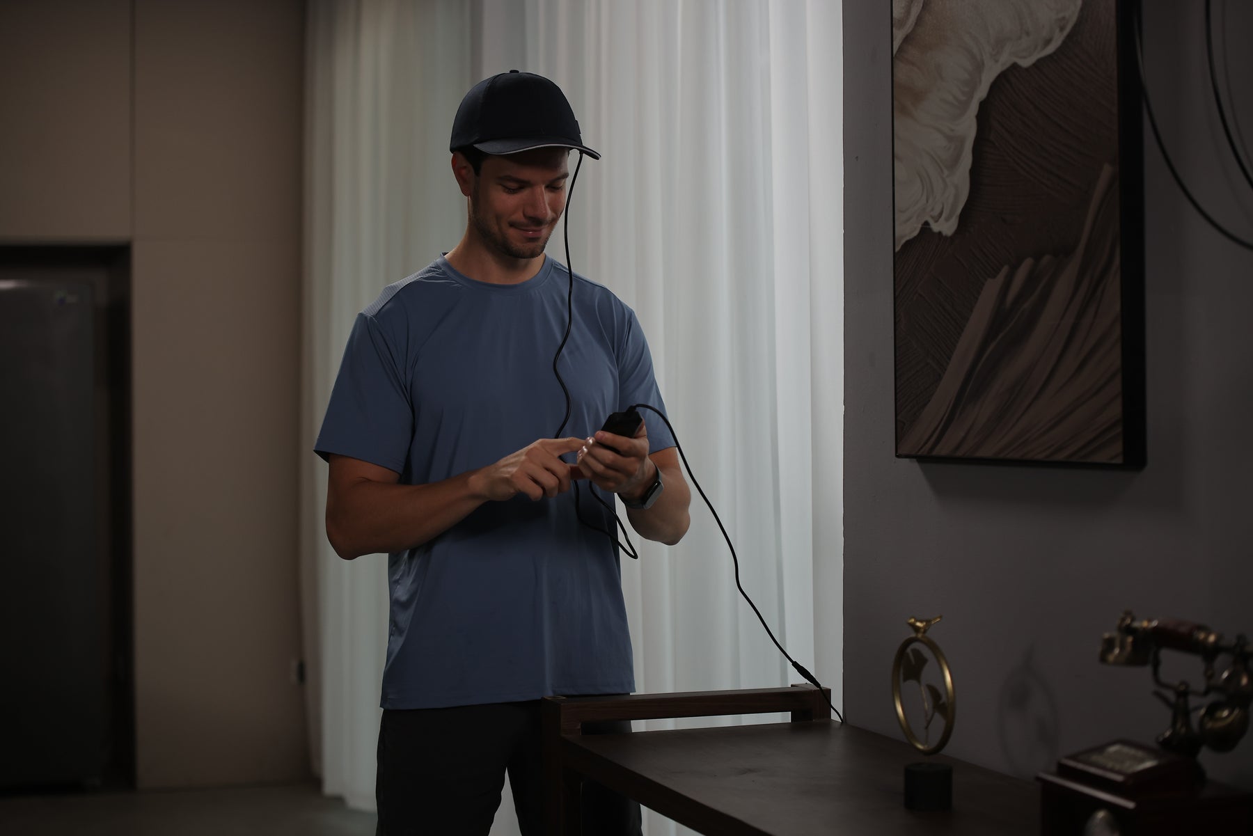 Kan bruges med både strømforsyning og powerbank. Tilslut kasketten via USB eller powerbank (hvis du vil gå rundt imens), og brug den 15-30 minutter ad gangen, tre gange om ugen.